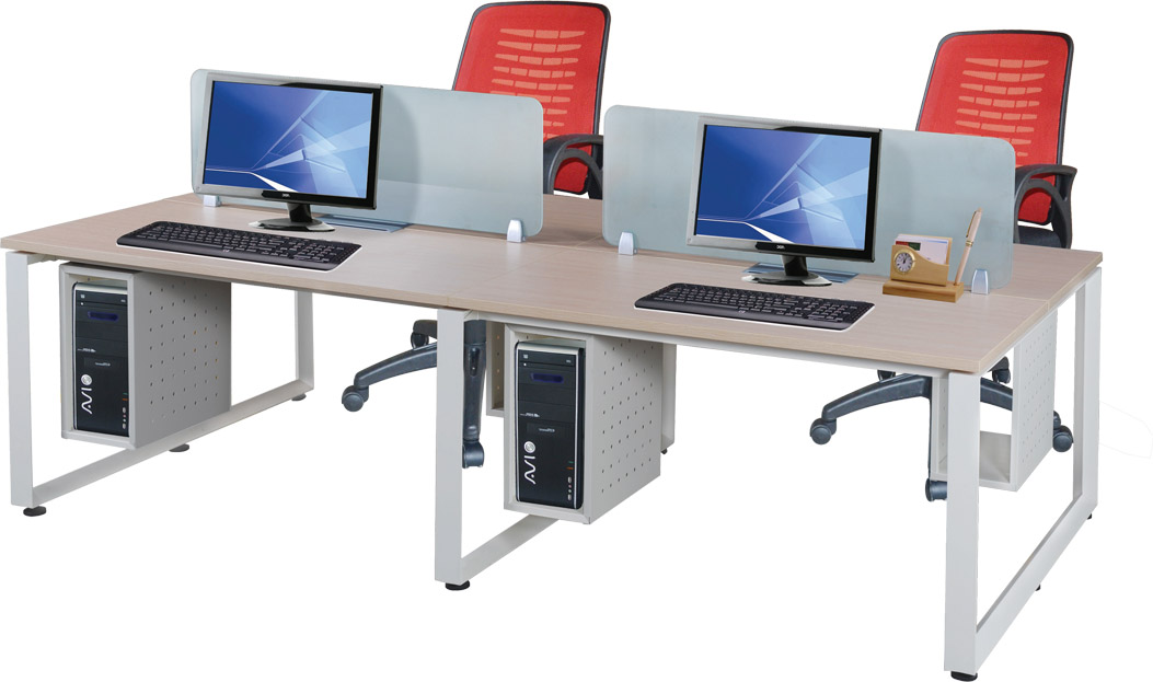 Mặt gỗ Melamine và có vách ngăn kính trên mặt bàn.